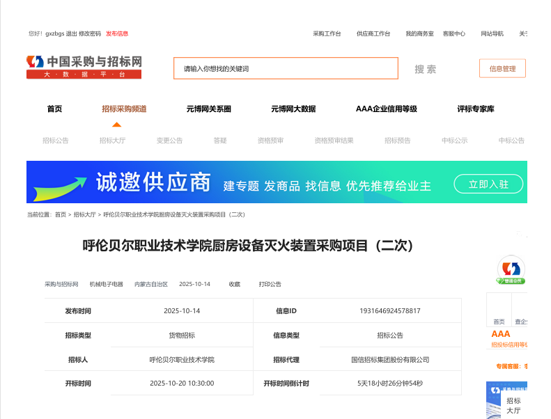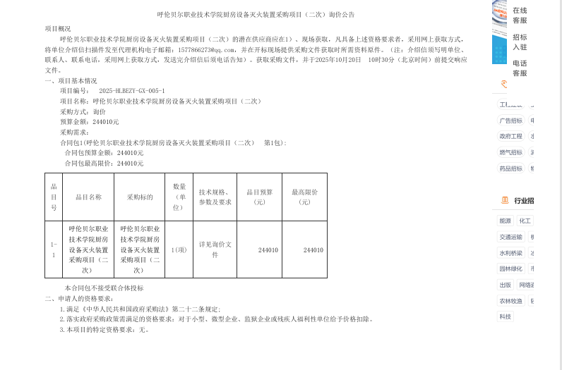 呼伦贝尔职业技术学院厨房设备灭火装置采购项目(二次)